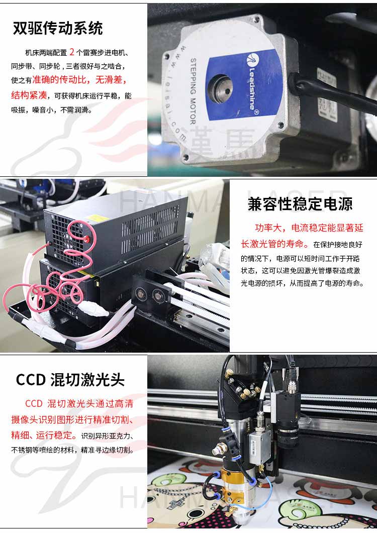 CCD高精度激光切割裁床采用DSP数字控制技术,采用一体化设计的框架结构,工作稳定可靠,最新软件支持与AutoCAD、CorelDRAW等CAD、CAM及各类图形处理软件无缝对接,直接原图输出。业内首家采用