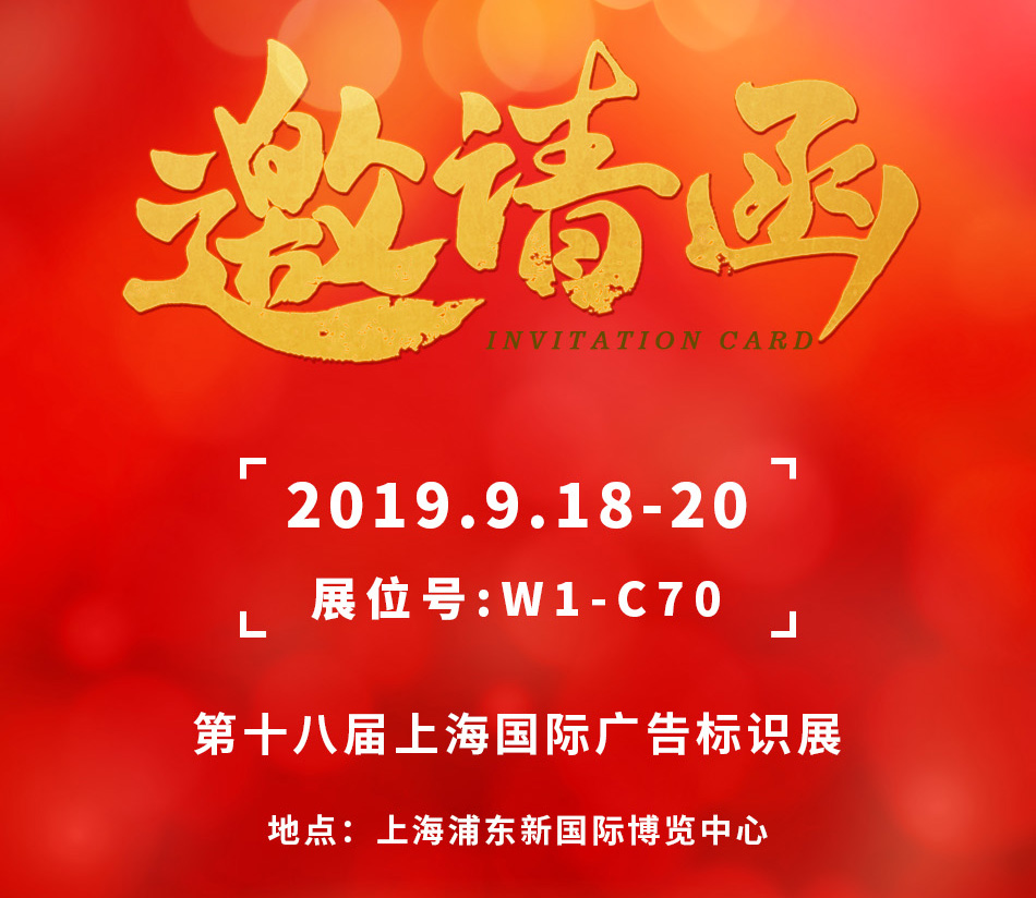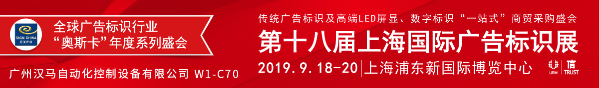 SIGN CHINA 2019 Shanghai——第十八届上海国际广告标识展,全球广告标识行业“奥斯卡”年度盛会,将于2019年9月18日—20日在上海上海新国际博览中心举行,汉马激光有幸受邀作为展商出席本次展会,届时我们将展示我们最优质的产品,并以最专业的服务、最饱满的热情,在上海新国际博览中心W1-C70等着您,期待您的莅临!