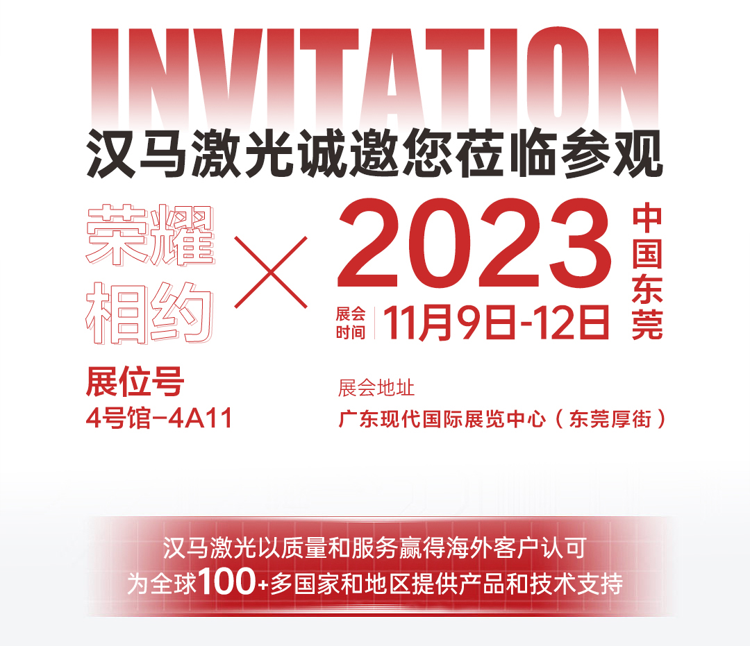 汉马激光诚邀您共赴2023/11月9-12日东莞国际机床展,制造业同仁必看的机床盛会。共同谱写制造业升级与跨越式发展的新篇章!